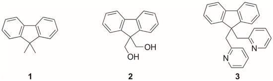 The fluorene derivatives 1–3 [9,9-dimethyl-9H-fluorene (1), 9,9-bis(hydroxymethyl)-9H-fluorene (2) and 9,9-bis[(pyridin-2-yl)methyl]-9H-fluorene (3)] were synthesized as shown in Scheme 1. The experimental data are given in the Supplementary Materials. Crystals suitable for X-ray structure analysis were obtained by slow evaporation of the solvent from a solution of the respective compound at room temperature. The crystallographic data are given below and in the Supplementary Materials (Table S1 and Table S2).