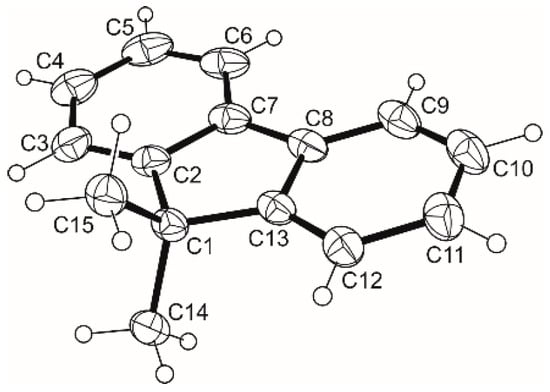The block-like colorless crystals of 9,9-dimethyl-9H-fluorene (1) (Figure 2), obtained from methanol by slow evaporation of the solvent at room temperature, exhibit the orthorhombic space group Iba2 (Z = 8). The twisting of the fluorene unit, caused by packing effects, manifests itself in an inclination angle of 5.8(2)° between the two benzene rings.