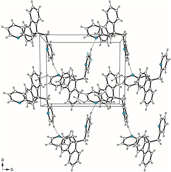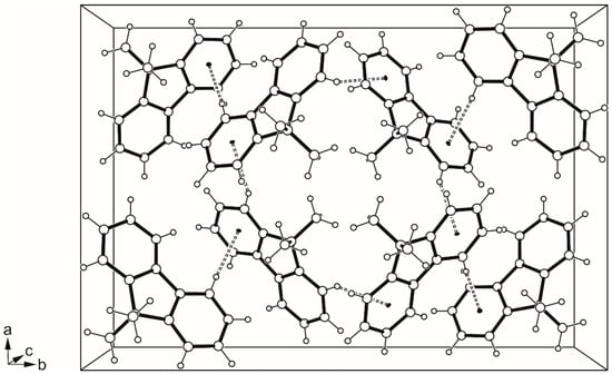 Due to the non-polar nature of the molecule, only a weak degree of molecular cross-linking is observed in the crystal, which is limited to C-H∙∙∙π contacts [34,35,36] involving the arene hydrogen atoms H3, H9 and H12 [d(H∙∙∙Cg) 2.84–3.01 Å, ∠(C-H∙∙∙Cg) 151–176°]. Consequently, van der Waals forces also play an important role in stabilizing the crystal structure. An excerpt of the packing structure of 1 is shown in Figure 3.