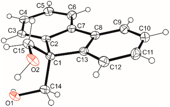 The platelet-shaped crystals of 9,9-bis(hydroxymethyl)-9H-fluorene (2) obtained from toluene/hexane have the orthorhombic space group P212121, with one molecule in the asymmetric unit of the cell. A perspective view of the molecular structure is shown in Figure 4. The fluorene unit of the molecule displays a slight twist, which is reflected by an angle of inclination of 5.1(1)° between the two benzene rings. The torsion angles given by the atomic sequences C1-C14-O1-H1 and C1-C15-O2-H2 are 84.5 and −96.1°, respectively.