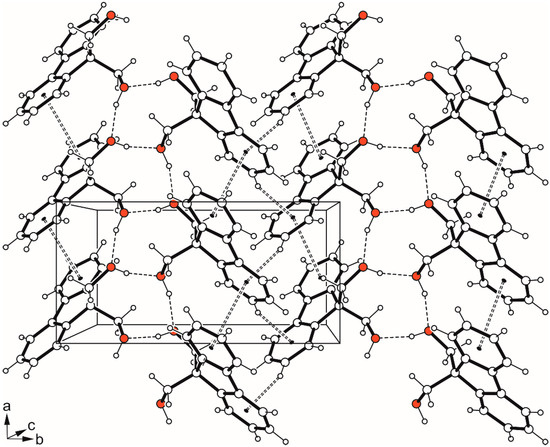 The excerpt of the packing structure shown in Figure 5 reveals a helical arrangement of the molecules in the direction of the a-axis, in which their OH groups create an infinite pattern of O-H∙∙∙O bonds [d(H∙∙∙O) 1.86(2), 1.87(2) Å]. Within this helical structure, offset- π∙∙∙π stacking forces [37,38,39] between the aromatic units of the molecules are observed [d(Cg∙∙∙Cg) 4.121(2) Å, slippage 0.991 Å]. The molecular helices are further linked by relatively strong C-H∙∙∙π interactions [d(H∙∙∙Cg) 2.67(2) Å, ∠(C-H∙∙∙Cg) 157°] with the participation of the arene hydrogen atom H4.