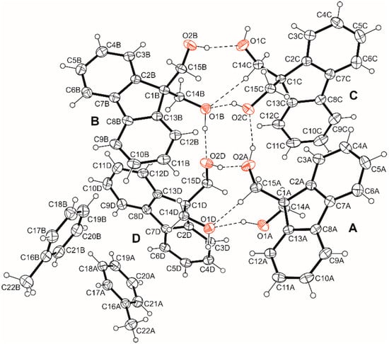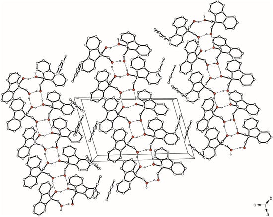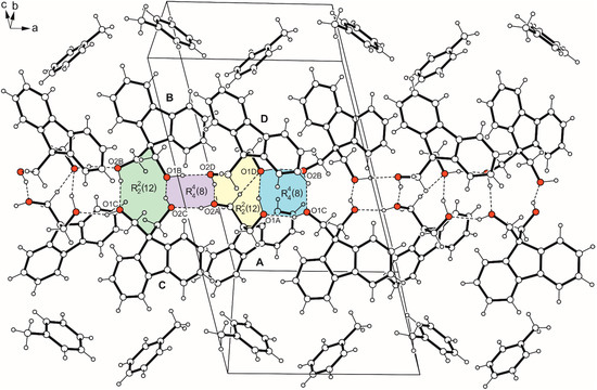 In the crystal of the solvate, the fluorene compound forms double strand-like aggregates running in the direction of the crystallographic a-axis, in which the molecules are linked by strong O-H∙∙∙O bonds [d(H∙∙∙O) 1.86(2)–1.93(2) Å]. In Figure 7, which shows a section of the molecular double strand, can be seen that the OH groups of the molecules are involved in the formation of cyclic hydrogen bond motifs of different structures and sizes. Within this pattern of strong hydrogen bonds, one OH group of each of the four independent molecules (A–D) contributes to the formation of two almost identical supramolecular synthons of structure R44(8). These are highlighted in purple and blue in the structural unit shown in Figure 7. At the same time, the OH groups of the pairs of molecules B/C and A/D generate two hydrogen bond motifs of the graph set [40,41] R22(12) (highlighted as green and yellow in Figure 7).