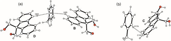 The two methylene hydrogen atoms H14F and H15A are involved in the formation of weak C-H∙∙∙O bonds [42,43,44,45,46,47,48,49] [d(H∙∙∙O) 2.58, 2.59 Å], so that the O atoms O1B and O1D serve as bifurcated hydrogen bond acceptors. In addition, the host molecules form a large number of C-H∙∙∙π contacts [d(H∙∙∙Cg) 2.73–2.97 Å] in which arene and methylene hydrogen atoms take part. A view of the crystal structure in the direction of the crystallographic b-axis (Figure 8) reveals that the guest molecules occupy the lattice voids, which are limited by fluorene units of the host molecules. The interaction of the two independent guest molecules with the host molecules takes place in different ways. While one of the toluene molecules is fixed in its position via C-H∙∙∙π bonds [d(H∙∙∙Cg) 2.85, 2.91 Å] with the host molecules B and D (Figure 9a), the ortho-H atom H17A of the second toluene molecule forms only one C-H∙∙∙π contact [d(H∙∙∙C) 2.82 Å] with the host molecule C (Figure 9b).