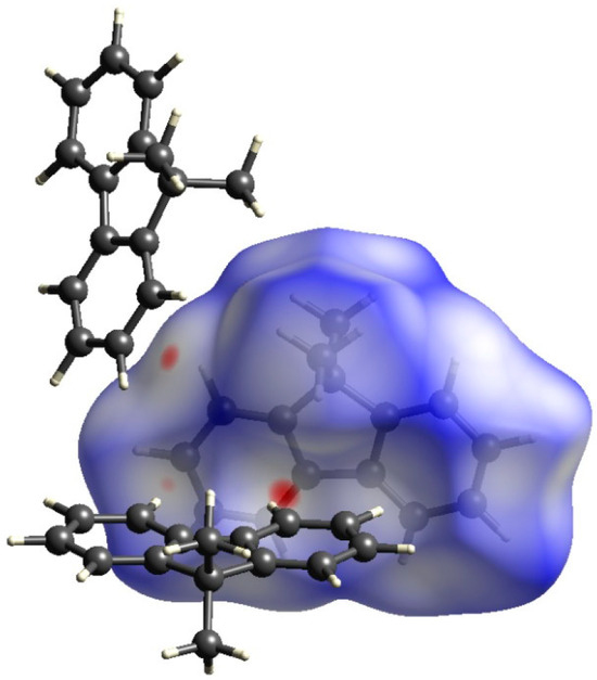 The small red patches on the dnorm surface of 9,9-dimethyl-9H-fluorene (1) shown in Figure 12 represent short C-H⋯π contacts. They occur in the 2D fingerprint plots (Figure 13) as a pair of sharp features at de + di ≈ 2.70 Å.