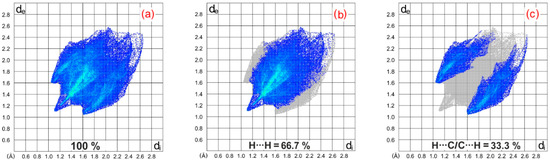 Two-dimensional fingerprint plots for 1 showing (a) all interactions and those delineated into (b) H⋯H and (c) H⋯C/C⋯H contacts.