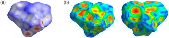 (a) Three-dimensional Hirshfeld surface of 2 mapped over dnorm in the range −0.6800 (red) and 1.3474 (blue) (a. u.); (b) Hirshfeld surface (two faces) mapped over shape-index.