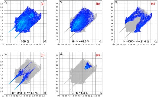 Two-dimensional fingerprint plots for 2 showing (a) all interactions and those delineated into (b) H⋯H, (c) H⋯C/C⋯H, (d) H⋯O/O⋯H and (e) C⋯C contacts.