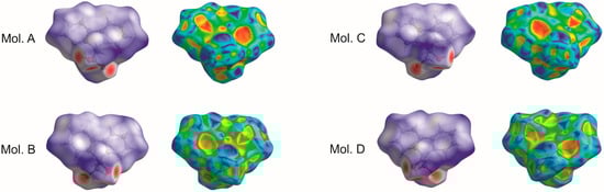 Structure 2a represents a solvate of the previously mentioned crystal structure. In the given case, the asymmetric unit contains four independent molecules of the fluorene compound and two toluene molecules. As in the solvent-free structure of the compound, the presence of red-colored circular spots on the dnorm surface of the molecules (Figure 16) represent donor and acceptor sites for O-H···O bonds. π···π-stacking interactions are absent in the crystal structure, which is indicated by the absence of neighbored red and blue triangles on the shape-index surface.
