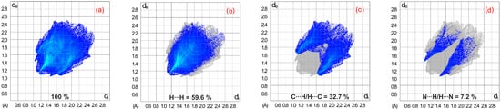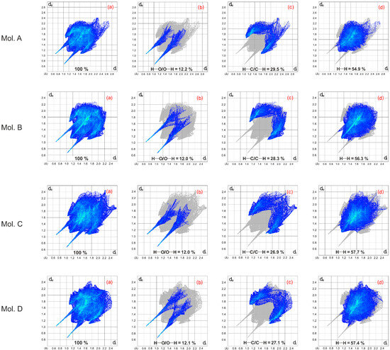 The total 2D fingerprint plots of the fluorene compound and the decomposition into the different types of intermolecular contacts present in the crystal structure are shown in Figure 17. A comparative view of the fingerprint plots of the molecules (A–D) reveals that the presence of solvent molecules naturally affects the molecular environment. This is shown in the fingerprint diagrams of the molecules labeled A and C by an asymmetric distribution of the contact points in relation to the main diagonal of the plot. H···H contacts represent the largest proportion of intermolecular interactions with 54.9, 56.3, 57.7 and 57.4%. Van der Waals forces thus make an important contribution to the stabilization of the crystal packing. The next largest contribution is provided by H···C/C···H contacts (29.5, 28.3, 26.9, 27.1%). The fingerprint plots of this interaction shown in Figure 17c indicate that all molecules are involved in the formation of C-H···π contacts, which appear in the plots as a pair of small wings at de + di ≈ 3.0 Å. Existing O-H···O bonds give rise to a pair of sharp spikes with a closest distance de + di ≈ 1.7 Å. The H···O/O···H contacts make up 12.0 to 12.2% of the molecular Hirshfeld surface.