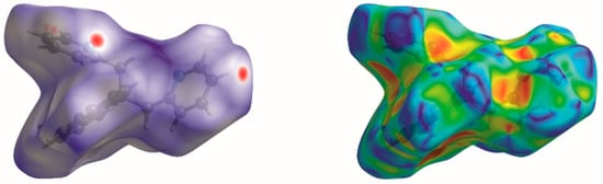 Hirshfeld surface analysis [61,62] is an effective method to gain insight into the coordination behavior of molecules in the crystalline state. To visualize and quantify the different types of intermolecular interactions [63], the molecular Hirshfeld surfaces mapped over dnorm and the corresponding two-dimensional fingerprint plots [64,65] were generated using the CrystalExplorer software (version 21.5) [66,67]. The normalized contact distance (dnorm) is based on the distances de and di, where de is the distance from the Hirshfeld surface to the nearest nucleus outside the surface and di is the corresponding distance to the nearest nucleus inside the surface. In the 2D fingerprint diagrams, the distance de is plotted against di. The areas in red on the 3D Hirshfeld surfaces correspond to contacts that are shorter than the sum of van der Waals radii [68,69] of the closest atoms, while contacts with distances longer (dnorm > 0) or approximately equal (dnorm ≈ 0) to the sum of the van der Waals radii are represented as blue and white regions on the surface, respectively. The shape-index of the Hirshfeld surface is a tool to visualize π⋯π stacking by the presence of adjacent red and blue triangles. The absence of adjacent red and blue triangles indicates that no interactions of this type are present.