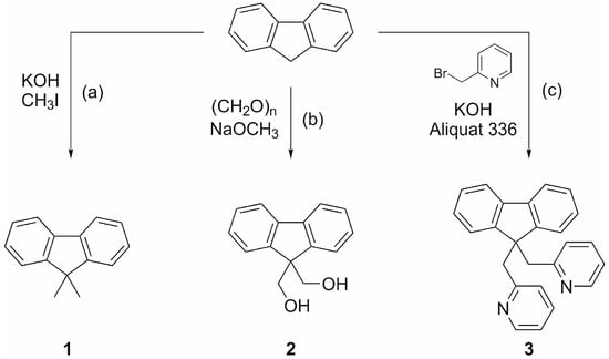 Synthesis of the 9,9-disubstituted fluorenes 1–3 (according to procedures in the literature [31,32,33]). Reagents and conditions: (a) KOH, CH3I, DMSO, 20 h, rt (93% of 1); (b) (CH2O)n, NaOCH3, DMSO/CH3OH 1 h, 0 °C (55% of 2); (c) KOH, 2-(Bromomethyl)pyridine, toluene/water, 10 h, 60 °C (43% of 3).