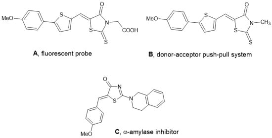 We present here the synthesis of the hitherto unknown 5-arylidenerhodanine 2 obtained from 5-(4-methoxyphenyl)-thiophene-2-carbaldehyde. This compound presents similarities with rhodanine-3-acetic acid derivative A, which was studied as a fluorescent probe for neurofibrillary tangles in Alzheimer’s disease brains [12] (Figure 1). It is also related to donor–acceptor compounds, such as B, described in 2020 in the search for new thiophene-based dyes for organic metal-free dye-sensitized solar cells [13].