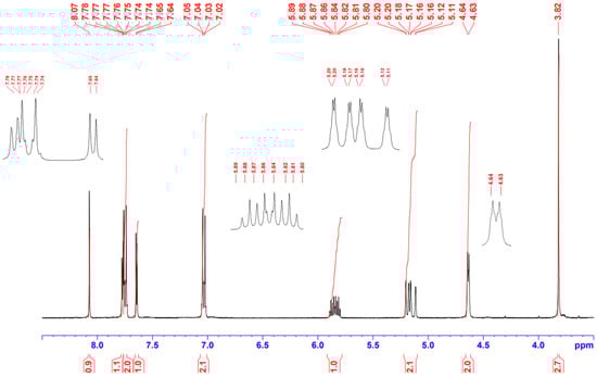 The 13C{1H} NMR also showed characteristic signals of the N-allyl group (CH2 at δ 46.2 ppm and =CH2 at δ 118.5 ppm) and rhodanine moiety (C=S at δ 191.8 and C=O at δ 166.3 ppm). The structure of compound 2 was also confirmed by HRMS analysis (see Figures S3 and S4 in Supplementary Materials).