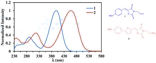 Finally, the UV-vis spectrum of highly π-conjugated 2 bearing a thiophene linker was compared to that of 3-allyl-5-(4-methoxybenzylidene)-2-thioxothiazolidin-4-one 1 (Figure 3). This literature-known compound [22,23] had already been synthesized in our former study [21]. Firstly, the introduction of a thiophene moiety between the N-allylrhodanin and anisole fragments induced an increase in the molar extinction coefficients of all bands (Table 1). Secondly, there was a bathochrome effect of about 23 nm for the first band and, which is remarkable, of 59 nm for the second band. This bathochromic shift was due to the extension of the conjugation that may result in a decrease in the energy difference between the HOMO and LUMO orbitals.