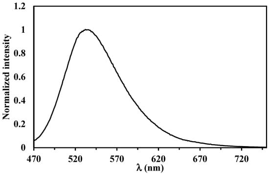 During this study, we were also interested in the luminescence properties of compound 2 in solution. After excitation at 450 nm, an intense emission band was observed (Figure 4) with a maximum at 535 nm. The fluorescence quantum yield ØF of 2 equaled 31%, and was determined using pyrene (ØF = 27%) in CH2Cl2 as a luminescence quantum yield standard [24]. This fluorescence band can be assigned to the lowest energy singlet state S1→S0 transition. To understand more in depth the contribution of the orbitals involved in the observed emission, detailed photophysical studies and theoretical calculations regarding this compound and other molecules of this family are underway.