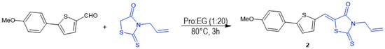 5-(4-Methoxyphenyl)-thiophene-2-carbaldehyde was synthesized according to the reported procedure [17] and engaged in Knoevenagel condensation with N-allylrhodanine in Pro:EG (1:20). After 3 h at 80 °C, the reaction workup only involved the addition of water for separating the targeted product from the aqueous phase containing the DES. Derivative 2 was obtained in pure form at a 96% yield, and no further purification was needed (Scheme 1).