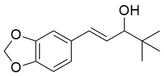 The title compound (1) was obtained within a project to synthesize analogs of the antiepileptic drug stiripentol. Compound 1 was synthesized by aldol addition of the lithium enolate of 4-(benzo[d][1,3]dioxol-5-yl)butan-2-one (2) to 3,3-dimethylbutan-2-one (3), followed by the dehydration of the resulting β-hydroxy-ketone under acid processing. The structure of 1 was established by 1D and 2D NMR spectroscopy and high-resolution mass spectrometry.