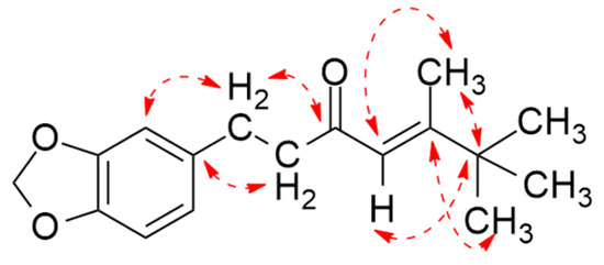 Using NMR spectroscopy, the structure of compound 1 was confirmed. In the 1H NMR spectrum (see Figure S1 in Supplementary Materials), a multiplet signal at 6.07–6.08 ppm corresponds to the only olefinic proton present in the molecule. Additionally, two singlet signals are observed at 1.09 pm and 5.90 ppm, corresponding to the protons of the tert-butyl group (Me-6a, Me-6b, H-7) and the methylene of the methylenedioxyphenyl group (O-CH2-O), respectively, as well as a doublet at 2.12 ppm for the methyl attached to carbon 5. To complete the proton assignment of the aliphatic chain, two multiplet signals are observed between 2.71 and 2.86 ppm, corresponding to the remaining methylene protons (H-1, H-2). Finally, the aromatic protons can be observed displaying a characteristic ABX-type spin system. This consists of three signals, each integrating for one proton: a doublet of doublets at 6.64 ppm (H-6′) and two doublets at 6.69 ppm (H-2′) and 6.71 ppm (H-5′).