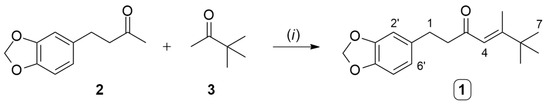 The novel compound (E)-1-(benzo[d][1,3]dioxol-5-yl)-5,6,6-trimethylhept-4-en-3-one (1) was synthesized through cross-aldol condensation based on lithium enolate chemistry. However, the low electrophilicity of ketones, combined with the steric hindrance caused by the bulky tert-butyl group in pinacolone (3), significantly prevented the attack of the enolate derived from 2, thereby reducing the overall formation of compound 1. Nevertheless, pure compound 1 was isolated as a yellowish oily mass and properly characterized. In addition, it could be of interest to compare in the future the results reported here with those arising from the application of the methodology (TiCl4-promoted aldol reaction) described by Sugiura et al. [16].