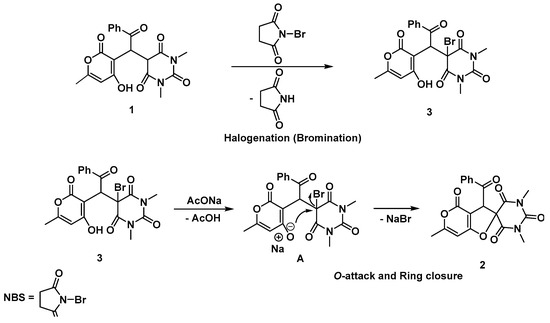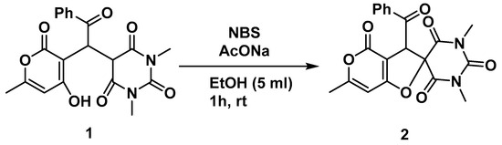 3.2. Synthesis of 3-Benzoyl-1′,3′,6-trimethyl-2′H,3H,4H-spiro[furo[3,2-c]pyran-2,5′-pyrimidine]-2′,4,4′,6′(1′H,3′H)-tetraone 2