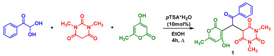 - Ryzhkova, Y.E.; Kalashnikova, V.M.; Ryzhkov, F.V.; Elinson, M.N. 5-(1-(4-Hydroxy-6-methyl-2-oxo-2H-pyran-3-yl)-2-oxo-2-phenylethyl)-1,3-dimethylpyrimidine-2,4,6(1H,3H,5H)-trione. Molbank 2023, 2023, M1640. [Google Scholar] [CrossRef]