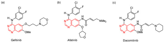 The quinazoline scaffold is found in many biologically active molecules, such as compounds that have bronchodilatory activity [1,2], antimycobacterial activity [3], or antihypertensive activity [4]. Furthermore, quinazoline derivatives are attractive anticancer agents due to their ability to act as protein kinase inhibitors [5,6]. For example, the N-(3-chloro-4-fluorophenyl)quinazolin-4-amine derivatives gefitinib [7,8,9], afatinib [10,11,12], and dacomitinib [12,13,14] are FDA-approved drugs used in the treatment of non-small cell lung cancer (Figure 1).