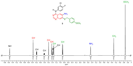 The molecular structure of the target compound N4-(3-chloro-4-fluorophenyl)-7-((4-methoxybenzyl)thio)quinazoline-4,6-diamine (3) was in agreement with its 1H NMR (Figure 2 and Figure S5). The NH proton at 9.54 ppm and the NH2 protons at 5.47 ppm were confirmed by the absence of a cross peak for these protons in the HSQC spectrum (Supplementary Information, Figure S9). Additionally, upon heating a sample of 3 in D2O at 100 °C for 24 h, partial H–D exchange (approximately 33%) is observed for these NH and NH2 protons. All quinazoline protons appear as singlets in the 1H NMR spectrum while the protons of the N-aryl group are coupled to the protons and the fluorine atom on the same ring. The methylene and methyl protons of the p-methoxylbenzyl group are visible as singlets at 4.30 and 3.72 ppm, respectively. Meanwhile, the aromatic protons of the p-methoxylbenzyl group are easily identified as the two doublets integrating to two protons each at 7.33 and 6.88 ppm, respectively.
