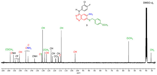 The 13C NMR spectrum (Figure 3 and Figure S6) of N4-(3-chloro-4-fluorophenyl)-7-((4-methoxybenzyl)thio)quinazoline-4,6-diamine (3) was also in agreement with the molecular structure. Assignment of the individual carbon signals to the various aromatic components of 3 was aided by HSQC (Supplementary Information, Figure S9) and HMBC (Supplementary Information, Figure S10). Notable features include the five doublets for the fluorine-containing aromatic ring, of which the doublet at 152.9 ppm with a coupling constant of 242 Hz can be clearly identified as the carbon directly bound to fluorine. The p-methoxybenzyl group is visible at first glance by the presence of the methoxy carbon at 55.1 ppm and the methylene carbon at 35.5 ppm, as well as the aromatic carbons at 130.2 and 113.9 ppm, respectively.
