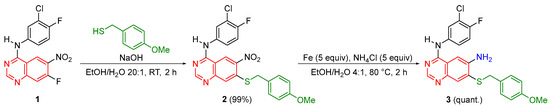 In summary, we have prepared the target compound N4-(3-chloro-4-fluorophenyl)-7-((4-methoxybenzyl)thio)quinazoline-4,6-diamine (3) in two steps from N-(3-chloro-4-fluorophenyl)-7-fluoro-6-nitroquinazolin-4-amine (1) by a high-yielding nucleophilic aromatic substitution with a subsequent reduction. Both the intermediate N-(3-chloro-4-fluorophenyl)-7-((4-methoxybenzyl)thio)-6-nitroquinazolin-4-amine (2) and the target molecule N4-(3-chloro-4-fluorophenyl)-7-((4-methoxybenzyl)thio)quinazoline-4,6-diamine (3) were characterized by 1H NMR, 13C NMR, 19F NMR, and HRMS. Additionally, the HSQC and HMBC of compound 3 allowed for the assignment of the 1H and 13C signals, while FTIR showed the presence of the N-H bonds. Future work could include studying the antibacterial properties of compounds 2 and 3.