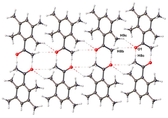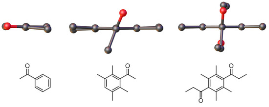 A noteworthy feature of the structure is that the carbonyl group and the mean plane of the tetramethylphenyl ring are not coplanar, with an angle of 68.07(17)° between the C2−C7 plane and the C8−C1−C2−O1 plane. This is in contrast with acetophenone (CSD code ACETPH), which has an equivalent angle of 3.69° (Figure 2) [13]. This observed angle strongly indicates that there is very little conjugation between the phenyl ring and the carbonyl group due to the steric effects of the ortho methyl groups. Furthermore, more significant twisting is observed in dipropiodurene (CSD code MEHJOZ), which has an angle of 86.24° between the ketone and xylene ring [14] (Figure 2).