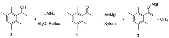 1-(2,3,5,6-Tetramethylphenyl)ethan-1-one, “acetyldurene” 1 is a versatile starting material in many reaction sequences, since both the ketone group can be functionalised, and the aromatic ring can react with electrophilic reagents. However, the reactivity of 1 is significantly different to simpler acetophenone derivatives. In common with pentamethylphenyl ketones [1], the carbonyl group of 1 is unreactive to the addition of nucleophiles due to the shielding effect of the 2,6-methyl substituents. It is possible to reduce 1 to the corresponding alcohol (2) using LiAlH4, although less reactive hydride reducing agents are ineffective [2] (Scheme 1). Furthermore, the reaction of Grignard reagents with 1 does not usually lead to the 1,2-nucleophilic addition product; instead, a magnesium enolate (3) is formed [3] (Scheme 1).