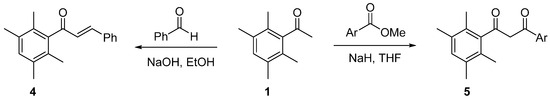 Ketone 1 can also be deprotonated by other strong bases; for example, 1 can undergo an aldol reaction sequence in the presence of sodium hydroxide in ethanol to form chalcone 4 [4] (Scheme 2). Ketone 1 can also be converted to 1,3-diketone products (5) when deprotonated with sodium hydride and then reacted with an aryl methyl ester [5] (Scheme 2).