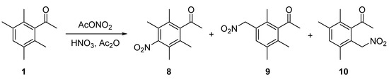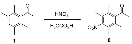 There is a single reaction site for electrophilic aromatic substitutions reactions to occur, and a limited number of examples of such reactions have been reported. The electrophilic addition of halogens to the aromatic ring is currently unknown. Instead, the halogenated compounds are usually prepared by Friedel–Crafts acetylation of the corresponding halogenated durene derivative [7]. There are, however, reports of successful nitration reactions of ketone 1 [8,9]. Nitration of 1 to afford nitro derivative 8 was achieved by reaction of the ketone in 70% nitric acid in trifluoroacetic acid [9] (Scheme 4). 1 has also been reported to undergo nitration in the presence of acetyl nitrate at 0 °C (generated from a mixture of acetic anhydride and fuming nitric acid) [9]. These more forcing conditions result in a complex mixture of products, which includes nitro compound 8 and the products resulting from the nitration of individual ring methyl groups (9 and 10) (Scheme 5).
