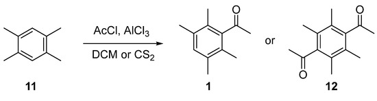 Ketone 1 (1-(2,3,5,6-Tetramethylphenyl)ethan-1-one) is usually prepared by Friedel–Crafts acetylation of durene (11) (Scheme 6). Control of the reaction conditions is required to ensure only compound 1 is formed, since it is possible to obtain the diacetylated derivative 12 as a byproduct. Compound 1 is favoured if the “Perrier method” is used; this approach requires that durene be added to a mixture of acetyl chloride/aluminium chloride in dichloromethane [10] or carbon disulfide [11]. A detailed study of the acylation conditions was conducted by Andreou, Bulbulian, and Gore in 1980 [12]. This work demonstrated that the diacetylated product 12 was most likely to be formed if an excess of aluminium trichloride relative to the amount of acetyl chloride was used.