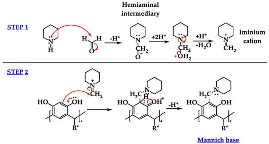 The Mannich reaction is a powerful tool in the field of organic chemistry for the formation and incorporation of C-C bonds in different molecules. This amino alkylation is a three-component nucleophilic condensation reaction between an acidic hydrogen compound, a non-enolizable aldehyde, e.g., formaldehyde, and a secondary amine or amide. The condensation produces a Mannich base, in which a hydrogen atom is replaced by an aminomethyl group [1,2,3]. In calix[4]resorcinarenes, polyhydroxylated macrocyclic molecules synthesized from resorcinol and aldehyde, which contain aromatic active hydrogens in the ortho position on the upper rim, can be replaced by the addition of an aminomethyl derivative in order to obtain the corresponding Mannich base. This process involves, as a first step, the reaction between amine and a methylation agent, e.g., formaldehyde, generating the hemiaminal intermediate, a subsequent dehydration, and the formation of an iminium cation. The second step involves a reaction in which the aromatic phenolic ring, rich in electrons in the calix[4]resorcinarene, attacks the iminium cation via an electrophilic aromatic substitution (SEAr). In this type of substitution, the electron-rich aromatic ring, in the presence of an electrophile, forms a cationic intermediate, which recovers its aromaticity by the loss of a hydrogen atom in position 2. Therefore, the corresponding Mannich base is formed in the ortho position by replacing aromatic hydrogen (Figure 1) [2,4,5]. When primary amines are used, the product reaction is generally a benzoxazine, due to a second aminomethylation step and the intramolecular nucleophilic attack of a phenolic hydroxyl group on the iminium intermediate. In some cases, the Mannich base has been obtained using primary amines, depending on the pH and the solvent used [6].