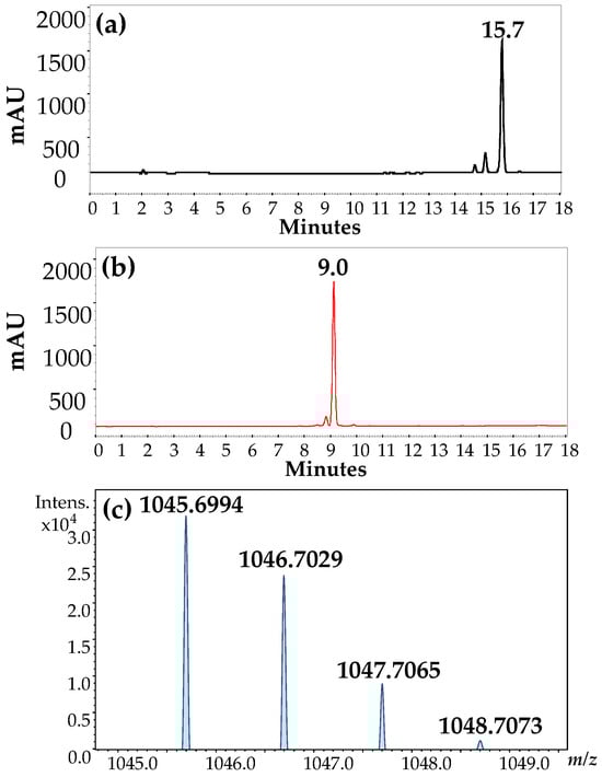 RP-HPLC chromatogram: (a) C-tetra(propyl)calix[4]resorcinarene precursor (1), (b) C-2,8,14,20-tetra(propyl)-5,11,17,23-tetrakis(N-(piperidin)methyl)calix[4]resorcinarene product (2), and (c) ESI-TOF/isotopic distribution of [M+H]+ of compound 2, with mass error of 7.6 ppm.