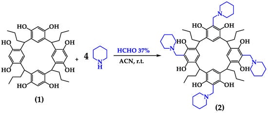 After obtaining precursor 1, the upper rim was functionalized by Mannich-type aminomethylation reaction using piperidine as the precursor amine. Since piperidine is a secondary cyclic amine, the reaction at position two in the aromatic units of calix[4]resorcinarene should correspond to a Mannich base. The reaction, using acetonitrile as a solvent, occurred at room temperature, in a short time and it was not necessary to use catalysts or reflux conditions.