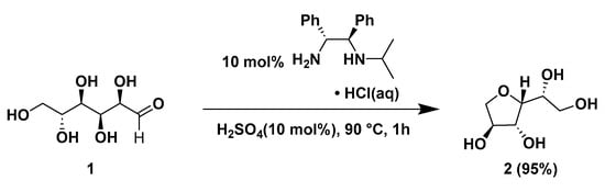 D-Glucose (10 g) was dissolved in 50 mL of deionized water in a round-bottom flask, along with sulfuric acid (0.5 mL) and 10 mol% of (R, R)-1.2-diphenyl ethylenediamine as a catalyst. The mixture was then heated to 90 °C and stirred for 2 h under reflux. The reaction was then cooled to room temperature, and the pH was adjusted to 7.0 using a sodium hydroxide solution. The product was extracted using ethyl acetate, dried over anhydrous sodium sulfate, and concentrated under reduced pressure to yield 1,4-sorbitan.