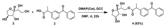 In addition, we reacted compound 2, which we previously synthesized, with ketoprofen. In this study, we used 4-dimethylaminopyridine (DMAP) and N,N′-dicyclohexylcarbodiimide (DCC) as catalysts and coupling reagents. The synthesis of 1,4-sorbitan and ketoprofen using DMAP and DCC was successful, affording (R)-2-((2R,3R,4S)-3,4-dihydroxytetrahydrofuran-2-yl)-2-hydroxyethyl 2-(3-benzoylphenyl)propanoate(4) (Scheme 2).