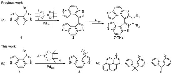 Benzo[1,2-b:4,3-b’]dithiophene (BDT) derivatives belong to the class of phenantrene-like tricyclic thiophene-containing compounds, which are widely studied in optoelectronics to build organic light-emitting diodes (OLEDs) [], thin-film transistors (OFETs) [,], dyes for solar cells (DSSCs) [,,,], hole-transporting materials for perovskite solar cells (PSCs) [,], π-conjugated polymer semiconductors [,], copolymers for solar cells [,,], and supramolecular structures [,]. The easy and regioselective functionalization of the BDT core allows the modulation of its physicochemical properties and makes BDT a valuable framework from which more complex and chiral heteroaromatic molecules can be prepared, including thiahelicenes and atropisomeric structures []. We recently reported an efficient two-step synthesis of 1-bromobenzo [1,2-b:4,3-b’]dithiophene (1) [], which was used as starting material to obtain tetrathia[]helicenes (7-THs) through the formation of bis(benzo[1,2-b:4,3-b’]dithiophene) 2 (Figure 1a). The latter compound was prepared in good yield (86%) by the palladium-catalyzed one-pot Miyaura borylation/Suzuki coupling of 1 in the presence of bis(pinacolato)diboron. In this work, we describe the synthesis and characterization of three novel BDT-based biaryl systems 3, which were obtained by Suzuki–Miyaura coupling between bromide 1 and polycyclic hydrocarbon boronic acid pinacol esters 4 (Figure 1b). Biaryls 3, in which the peculiar electronic and photophysical properties of pyrene [], fluorene [], and fluorenone [] are combined with the electronic features inferred by the presence of sulfur atoms in the BDT skeleton, represent useful intermediates from which novel chiral molecules can be obtained.