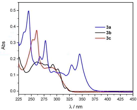 The UV-vis absorption spectrum of 3a showed the typical resolved peaks of the pyrene moiety at around 245, 267, 278, 329, and 345 nm, with an absorption extending towards the visible region when compared to compounds 3b,c. This behavior was in agreement with the data previously obtained for the UV spectrum of 3-(pyren-1-yl)benzo[b]thiophene []. On the other hand, in the case of 3b and 3c, the absorption mainly occurred in the 250–300 nm region, with 3c displaying a distinct peak at 260 nm attributable to the fluorenone moiety.