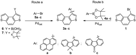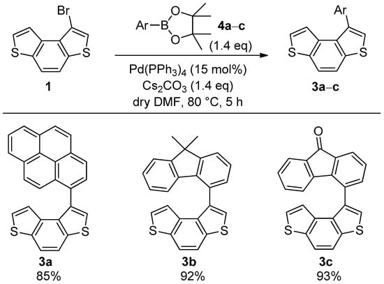 All reactions were carried out under an inert atmosphere by means of standard techniques for manipulating air-sensitive compounds. Reagents and solvents obtained from commercial sources were used as received. 2-(9,9-Dimethyl-9H-fluoren-4-yl)-4,4,5,5-tetramethyl-1,3,2-dioxaborolane (4b) and 4-bromo-9H-fluoren-9-one (5c) were purchased from TCI. Anhydrous DMF was purchased from Sigma-Aldrich (100 mL bottle with crown cap). 1-Bromobenzo[1,2-b:4,3-b’]dithiophene (1) [] and 4,4,5,5-tetramethyl-2-(pyren-1-yl)-1,3,2-dioxaborolane (4a) [] were synthesized according to the literature. The outcome of the reactions was monitored by thin-layer chromatography (TLC) on silica gel 60 F254 precoated plates, and plates were visualized with short-wave UV light (254 and 366 nm). Column chromatography was performed on silica gel 60 (70–230 mesh).