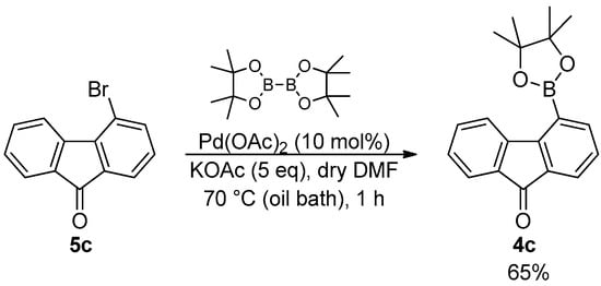 In particular, the synthesis of 4-(4,4,5,5-tetramethyl-1,3,2-dioxaborolan-2-yl)-9H-fluoren-9-one (4c) was performed by the Miyaura borylation of commercial bromide 5c, following a similar procedure to that reported in the patent from Aventis Pharma [] (Scheme 2).