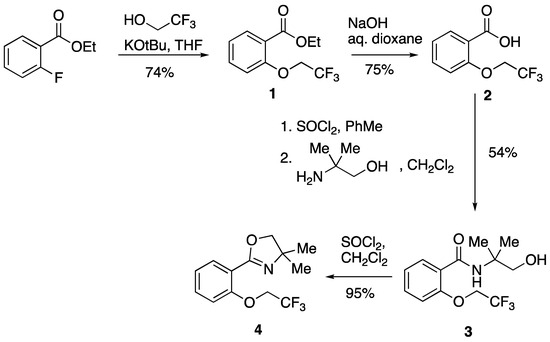 Among simple heterocyclic auxiliary groups, the 4,5-dihydrooxazole (or 2-oxazoline) has proved to be one of the most useful, directing ortho-metalation on an aryl ring and facilitating a wide range of subsequent synthetic transformations, many of them in an asymmetric fashion [1,2,3]. In our own work, we have studied 2-(2-benzyloxyphenyl)oxazolines and observed that, upon treatment with a strong base, they may undergo either cyclisation to afford 3-aminobenzofurans or 1,2-Wittig rearrangement. While treatment with n-BuLi/KOt-Bu generally led to direct cyclisation to benzofuran products, using n-BuLi on its own gave the Wittig rearrangement [4]. It was later found that in isomeric thiophene-based systems, products derived from either direct cyclisation or Wittig rearrangement could be obtained depending on the distance between the oxazoline and benzyloxy functions [5]. In the meantime, it was discovered that the N-butylamide group, CONHBu, is more effective in directing the Wittig rearrangement in such systems [6]. In an attempt to broaden the scope of such transformations, various alternatives to the benzyloxy substituent have been examined including trifluoroethoxy, OCH2CF3, and this was prepared in the N-butylbenzamide series but did not react on treatment with a strong base. As described in a review article [7], the formation of α-trifluoromethyl anions may result in a range of different reaction outcomes depending on the other groups present. In this paper, we describe the stepwise synthesis of the corresponding 2-(2-trifluoroethoxyphenyl)oxazoline 4 and full characterisation of the final product and the intermediates for the first time.