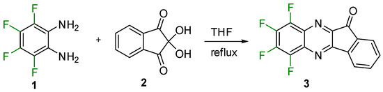 The target indenoquinoxalinone (compound 3, Scheme 2) was synthesized by the Körner–Hinsberg-type condensation of 1,2-diamino-3,4,5,6-tetrafluorobenzene [23] with ninhydrin (compounds 1 and 2, respectively; Scheme 2) in THF. The structure of 3 was confirmed by single-crystal XRD (Figure 1), multinuclear NMR, LC-MS, and elemental analysis. The compound is a fluorophore emitting at 490 nm in CHCl3 solution.