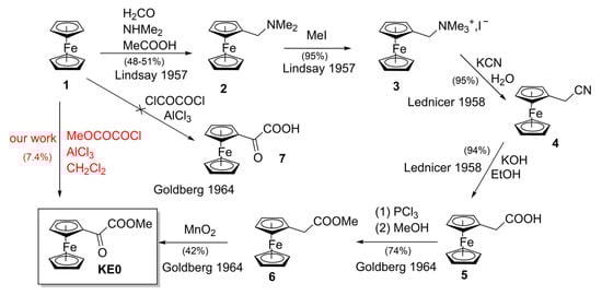 Synthesis of methyl 2−ferrocenyl−2−oxo−acetate KE0 in six steps and our synthesis in one step using Friedel–Crafts method (in red). References: Goldberg 1964 [11], Lindsay 1957 [12], Lednicer 1958 [14].