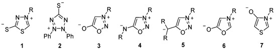 - Baker, W.; Ollis, W.D. Meso-ionic compounds. Quart. Rev. 1957, 11, 15–29. [Google Scholar] [CrossRef]