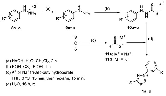 The mesoionic 1,3,4-thiadiazole-2-thiolates, which were prepared in this work, were accessible via the reaction route shown in Scheme 1. Retrosynthetically, the heterocycles can be reduced to the corresponding N-arylated hydrazines 9a–d, carbon disulfide, and the C1-building block dithioformate 11a,b mentioned above (see Scheme 1).