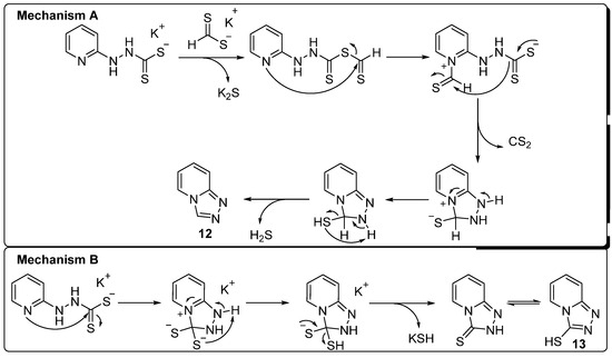 In contrast to the fast conversion of potassium salts 10a–d for the syntheses of the heterocycles 1a–d, no conversion to the anticipated mesoion 1e was observed. Instead, a ring-closure reaction yielding [1,2,4]triazolo[4,3-a]pyridine 12 was observed following a competitive nucleophilic attack of the nitrogen of the pyridine ring at the dithioformate moiety, as described in the proposed mechanism in Scheme 2 (mechanism A). This stands in analogy to literature procedures for the syntheses of 12 via, e.g., base-promoted oxidative iodination of the corresponding hydrazone [35] or the addition of C1-building blocks such as formic acid to the corresponding hydrazine [36]. However, to the best of our knowledge, this is the first reported case of the isolation of 12 starting from thioformates. In addition to the formation of the bicyclic system 12, conversion of the potassium salt 10e to [1,2,4]triazolo[4,3-a]pyridine-3-thiol 13 was achieved by stirring 10e in an aqueous solution at 100 °C for 48 h without the addition of dithioformates 11a,b (Scheme 2, mechanism B), in analogy to the direct addition of carbon disulfide to 2-hydrazinepyridine 9e in aqueous solution as described in the literature [37].