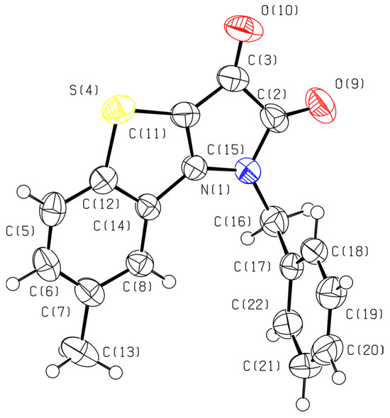 To the best of our knowledge, this is the first example of the construction of fused tricyclic systems possessing benzo[b]thiophene and pyrrole-1,2-dione fragments from the derivative of 3-pyrrolin-2-one. It was previously reported that the synthesis of benzo[b]thiophene-based molecules from arylsulfanyl-containing substrates can be achieved through the intramolecular arylation of the C–H bond of thioethers R1SR2 (R1 and/or R2-aryl moiety) in the presence of bis(triphenylphosphine) palladium(II)dichloride or palladium acetate catalysts [10,11,12,13,14,15,16]. Here, we present the formation of a benzothiophene scaffold from the p-tolylsulfanyl derivative of pyrrolinone without metal-based catalysts.